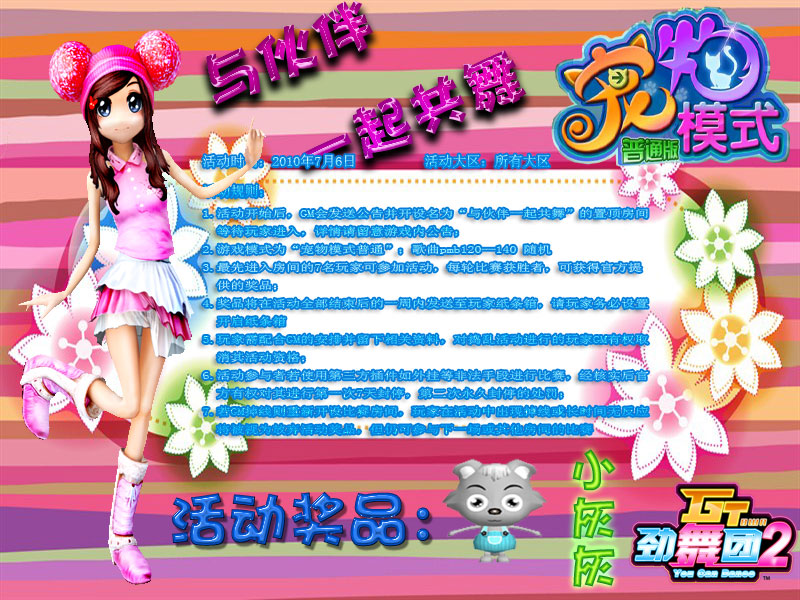 为迎接V1.9更新,《GT劲舞团2》在更新当天,GM将举行一系列的庆典活动,给各位玩家准备了许多的礼物。其中就包括了新宠物:“小灰灰”。想获得新宠物小灰灰,就请参加在线GM举办的“与宠物一起共舞”的活动哦。只要你进入GM开设的名为“与伙伴一起共舞”的活动房间,与大家一起PK。获胜者将获得可爱的“小灰灰”哦。 玩腻了情侣和组队模式,让我们来点新鲜的乐趣吧,和你的朋友一起,携伴自己的“新伙伴”来场甜蜜大比拼吧!看着那些可爱的箭头和身边小宠的舞动,是不是觉得很可爱呢?胜利后与你的“炫宠”分享胜利,更让我们喜悦的心情添上了几分