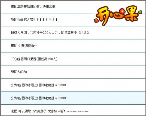 组团盛况 为了组满200人满团,广大玩家可是卯足了劲,团长在遍地拉人,团员在四处找团,目的只有一个:组更多人,拿更多奖。一时间,QQ上、论坛上广告漫天飞。在官方论坛上,除了开发建议,更多的是组团拉人的帖子。组团活动一开,玩家逛论坛的兴致都提高了很多呢! 还没组到团的玩家,说不定可以在论坛找到最后的好机会哦: 活动快结束了都还有这么团,果然火爆 |