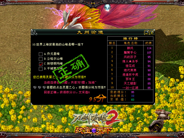 每位大于20级的玩家都可以在每天的18:30至19:30在瓦当镇NPC九州论道弘化使【141.101】处报名。每晚的19:30九州论道活动将准时开始,届时不论你身在何处,都可以点击答题提示按钮参加答题活动。 不论身在何处,都可以方便的参加答题活动。 |