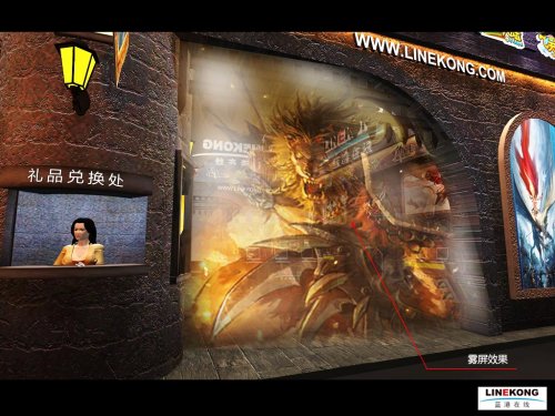 充分展现蓝港在线此次参展CJ高科技实力的雾墙上也映衬出了《佣兵天下》中的兽人形象,朦胧而又清晰,遥远却又触手可及,这正是虚拟世界给我们带来的魅力! 雾墙效果 |