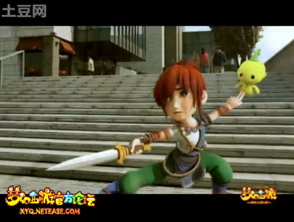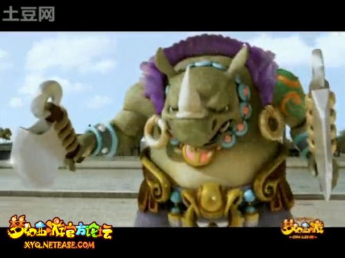 剑侠客这厢也知道不免一战了,从台阶坐着位置一下弹坐而起跳了下来,可见轻功了得。但毕竟犀牛将军的造型太鼓惑了,我们的侠客等级不高,有点害pia~