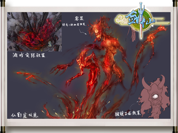 御剑飞仙与万仙大战,是《剑仙》的核心玩法。而本次曝光的设计稿,便是以现有地图从未出现的新场景为背景而展开的,大面积的云雾和浮空灵石无疑表明,这一系列设计思路必定和飞行系统有着重大关系。 手稿右下角随意写就的“飞仙追逐战”五个字,却隐藏着深深的寓意。刚刚曝光的五大长老坐镇的八卦神坛,与右上角岩浆滚滚的噩梦之地遥相呼应,一场仙魔大战呼之欲出。 火焰妖魔代表的是一个强力的BOSS,还是一股神秘的力量? |