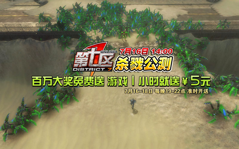 《第七区》今日14点杀戮公测震撼开启,射击与策略游戏强势碰撞,火星撞地球般的火爆,《第七区》今日14点杀戮公测,带给你前所未有的游戏感受,人虫对抗演绎史无前例的精彩,今日14点一切尽在《第七区》。公测活动届时全面开启,在线一小时就送¥5元。 《第七区》今日14点杀戮公测,这个战场期待你的加入 你需要的不仅仅是勇气,醉卧沙场君莫笑,古来征战几人回