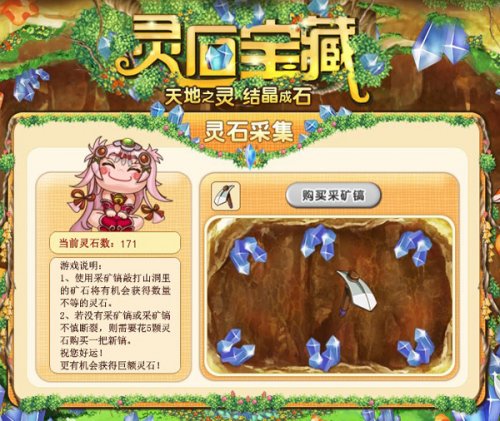 灵石采集 全新的游戏版块,势必会让玩家眼前一亮,玩家们通过采集灵石,可以挖出各种宝藏。更有机会成为超级幸运儿,一次成功砸出100颗灵石。如此诱人好机会,只在《神兵传奇》灵石宝藏中。轻松的游戏氛围,简单容易上手,玩家只需点击“灵石采集”页面,方可进入游戏,使用采矿镐敲打山洞里的矿石便有机会获得数量不等的灵石。 |