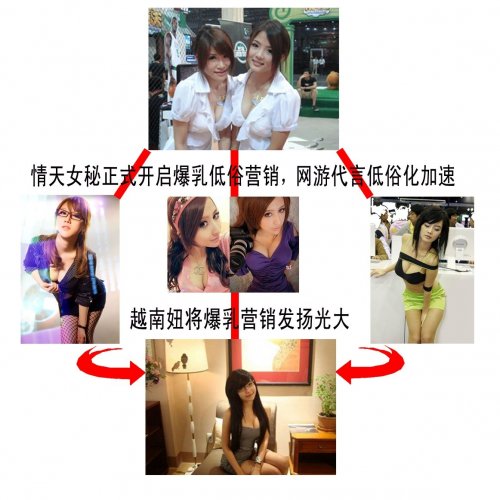 2009:美女营销恶性竞争致使低俗营销粉墨登场 网游代言的低俗化从什么时候开始的?2009年的ChinaJoy! 2009年上半年开始,台湾杀很大的童颜巨乳瑶瑶意外在而国内走红,这给了国内某些人启示。随后2009年Chinajoy上情天女秘出现,开启低俗营销的魔盒,以爆乳胸器为主打的低俗营销正式到来。随后越南妞登场了,林柯彤也开始以乳取胜,可怜的小优博出位硬给挤了条沟出来,无辜的女主策也被迫脱下上衣露出那一对可能以前只藏给男友观瞻的豪乳。一时间网络游戏的营销几乎全部打上了“胸器”的标签。 2009年的下半年,有谁还记得曾经迷倒无数玩家的丁贝莉是个平胸? 这场声势浩荡的胸器营销图留下的女人胸印,如图所示: