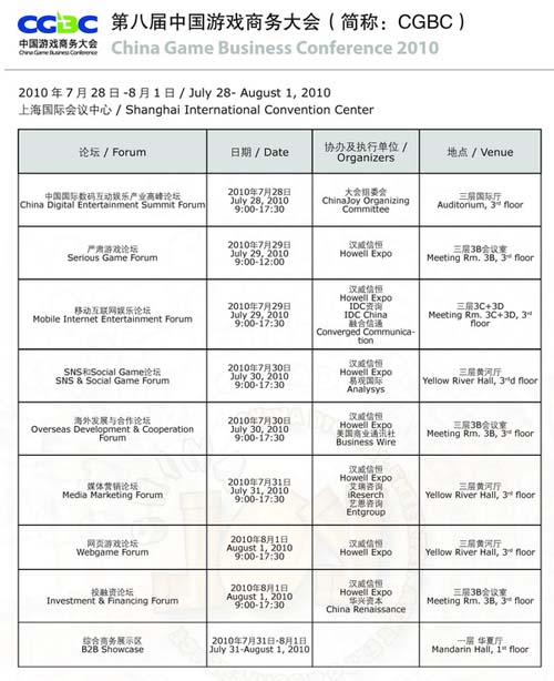 2010 CGBC日程 CGBC、CGDC和CGOC三大国际性会议将邀请全球近200名行业知名人士、技术专家发表演讲,尤其是中国游戏开发者大会在继承往届的办会理念和成功经验的基础上将续写辉煌。