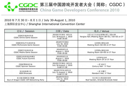 2010 CGDC日程 2010年,ChinaJoy组委会联合上海多媒体协会联合承办首届“中国游戏外包大会”,双方整合了彼此的优势资源,结合国际上同类型活动的运作模式并加以调整以吻合中国本土企业的具体需求,现场组织“接/发包方的商务洽谈会”等活动,强调了ChinaJoy一直以来“服务于企业”的活动理念,让企业从参与中最大限度的获得商业价值,形成国内外企业能全面参与大会活动的原动力。