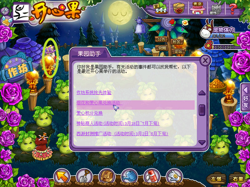 作坊信息发布官 现在作坊系统这么火热,果园助手也义无反顾地担当起了信息发布官。我们都知道,玩家达到18级,或者邀请5位好友体验《开心果》达到3级,就能获得作坊测试资格。那作坊具体有哪些精彩玩法呢?不想去官方网站找标题的玩家可以直接点击果园助手界面的“作坊系统抢先体验”,直接跳转作坊专题页面,了解资格获取、精彩玩法、升级指南等多方面信息。 果园兑换大使 《开心果》中有各种各样的兑换活动,比如世界杯、儿童惊喜礼包的活动兑换,而更多的是日常活动中的兑换。在活动期间,我们随时可以找果园助手来兑换各种道具。例如,用烟花和爱情果实兑换烟花礼炮和爱心包;用仙人掌、橙子和柚子兑换神秘商人礼包;通过“迎内测送爱心”活动换取河马宠物……真怀疑果园助手后面的小房子是不是仓库,什么都能放下。 各种活动都可以找果园助手哦! |