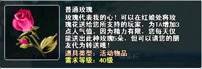 道具名称 功效 普通玫瑰 使用后增加3点人气值 野玫瑰 使用后增加3点人气值 红玫瑰 使用后增加5点人气值 绚丽的金玫瑰 使用后增加8点人气值 七彩至尊玫瑰 使用后增加15点人气值 小西红柿 使用后减少1点人气值 大西红柿 使用后减少4点人气值 |