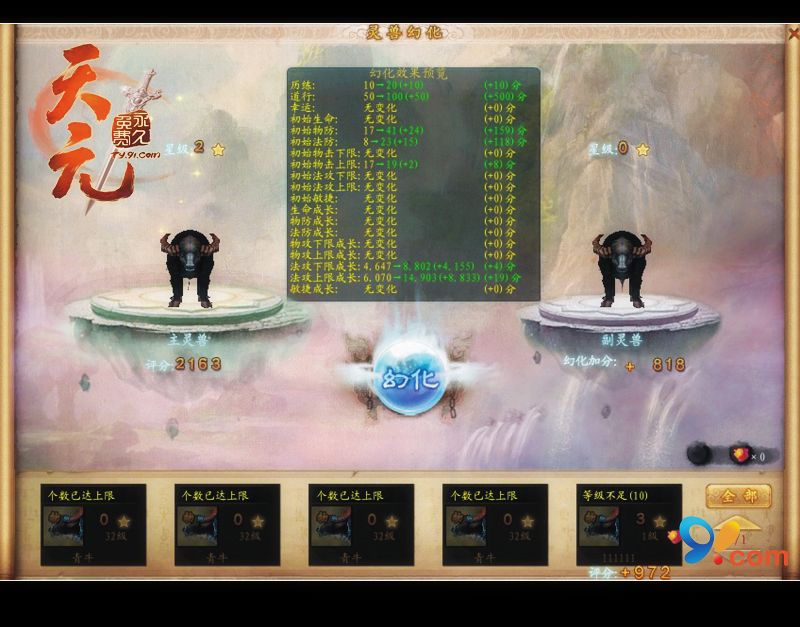为人尊者,必步天元!在玄幻世界里,要当独一无二的修真者,除了拥有强大的装备之外,与众不同堪称极品的灵兽当然是必不可少的。2010年玄幻修真第一网游《天元》于7月27日巅峰公测即将推出,这里有数百种上古传说中神兽和圣兽,等着你来降伏。今天我们就将独家奉上上古灵兽养成秘籍——极品灵兽5步养成手册,为你详细介绍极品灵兽种种成长的诀窍。 天元原生灵兽 第一步:选择灵兽技能 作为修仙成魔左膀右臂的上古灵兽,每一种灵兽都有属于自己独特的技能。有进攻型,防御型,辅助型和持续伤害型等等各种类型的技能。比如青牛不仅仅是防御力超高,天生特技“血脉灵环”随时分担主人受到的伤害,减少主人死亡率。 天元神奇幻化