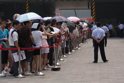 一年一度的游戏盛会chinajoy已经正式在上海浦东新国际博览中心开幕,进入第二天,虽然有了充分的思想准备,但是到了现场,小编还是被排队的场面吓到了,早上尚未开馆,入场的队伍就已经排到了2号馆。 除了排队之外,各大厂商门前也是熙熙攘攘,尤其是部分厂商的体验区,更是玩家争先恐后索取体验机会,场面堪比春运时的火车站,联想到最近上海世博会的假资讯“排队挤怀孕”事件,小编感受了下,照这个排法,还真有可能。 馆外排队一度排到2号馆 |
