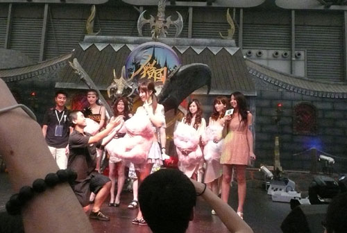 《猎国》展台居然出现真的跪求!玩家为了得到《猎国》超可爱粉兔子公仔,直接就像赠送公仔的showgirl跪拜起来了!虽说男儿膝下有黄金,但是为了抢得一只《猎国》兔子公仔送给女友,我们的男玩家可是豁出去了!