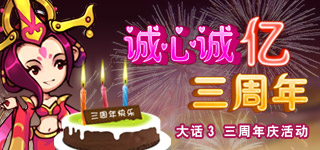 2010年,我们与《大话西游3》风雨同路,携手走过真情“话”意三周年。在这个特别的日子,大话3感恩回馈,诚心诚“亿”回赠玩家,不断送出高级守护、笔记本电脑、手机、MP4、神兵等价值不菲的大奖!活动一浪接一浪,多到不敢相信!