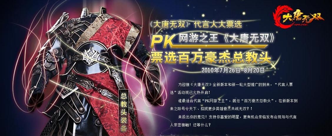 《大唐无双》的代言人之争越演越烈终,呼声最高三大功夫巨星里,谁将成为号令三军的总教头,带领玩家将热血PK的游戏进行到底?票数一路领先的甄子丹是否能如玩家所愿,以PK之王的地位代言PK网游之王的《大唐无双》?《大唐无双》至尊代言人的神秘面纱即将于近日揭晓!