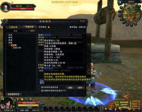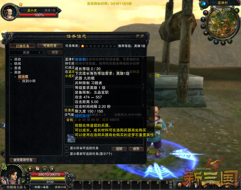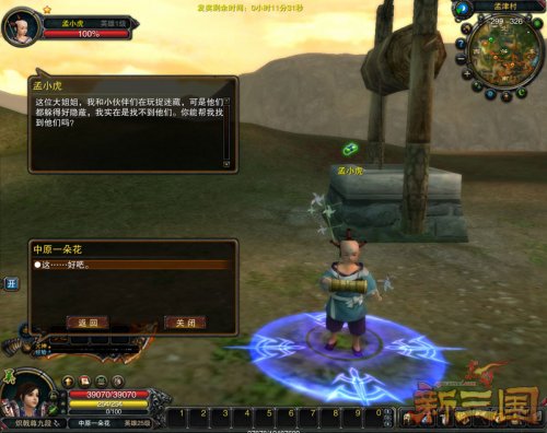 《赤壁·新三国》开放英雄等级后,不少玩家已经成功实现转生并且已在全新地图洛阳、草原开启了新的三国征程!然而,隐匿在洛阳硝烟之下和茫茫草原之上的怪物同样实力得到倍增,想像收拾普通怪物一样将他们撂倒,并非易事。因此,快速提高自己战斗力以及获得一套具有特殊属性的高阶装备对于转生后的英雄们来说极为重要。玩家转生英雄级后,可以通过洛阳、草原等地的主线任务获得大量升级阅历以及高阶装备,想要比别人抢先一步获得提升,一定不要忘了去游戏中将这些任务一网打尽哦! 轻松捉迷藏 送九阶蓝色武器 英雄1级的玩家可以在长安城NPC【长房】的帮助下传送至洛阳孟津村,在这里,只要你耐下心来帮助村口的小男孩儿【孟小虎】完成迷藏游戏,先后找到三个淘气的小朋友即可开启九阶蓝色武器系列任务,同时获得丰厚游戏奖励。不过,三个小朋友藏身处极为隐秘,你可要睁大眼睛在孟津村周围仔细查看哦! 捉迷藏任务 捉迷藏任务奖励