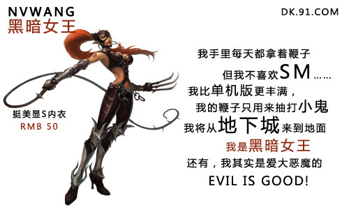 黑暗女王,魔鬼身材魔鬼心,拿着鞭子,我就是女王。 丰满的黑暗女王 《地下城守护者世界》源自牛蛙工作室经典单机作品——《地下城守护者》。游戏将“创意、恶搞、反英雄”理念发挥的淋漓尽致,在游戏中,玩家 [编辑:糖糖] |