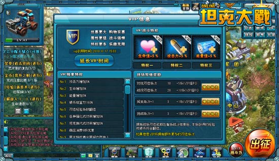 【专享13重福利:VIP会员证】 在坦克大战中最不容错过的商城道具就是VIP会员证了,拥有VIP会员证就可独享十余种游戏福利!包括每日6重奖的签到奖励,每天16小时的在线训练,攻击力、生命值、能力值都增加5%,各种强化、改造换代成功率增加5%,商城消费最低可享8.1折优惠等等,让你不论赚钱、升级还是PK都能高人一筹! VIP会员的专属待遇 |