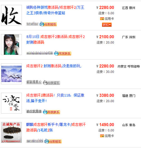 《成吉思汗2》1个激活码的交易价格达到几千元 在网络交易网站5173和淘宝网,《成吉思汗2》8月10日首次封测的激活码的标价从最低的1800元至3500元不等。一位“四皇冠”店主向记者透露,“周末两天平均每天接待数百个买家开价千元欲求购激活码,但是我有只有5个激活码,而且早就被预定卖完了,现在市面上应该已经没有号了”。 但也有部分业内人士表示,《成吉思汗2》不排除上市前炒作的可能性。 一名求号玩家坐下地方阻挡车辆行驶 新浪游戏就此连线麒麟游戏相关负责人,对方表示不知情,并称“《成吉思汗2》明日下午开启首次删档测试的计划也未更改”。截至发稿前,麒麟游戏官方尚未对此事件发表任何声明,也未有增补激活码的公告。 [编辑:灰色] |
