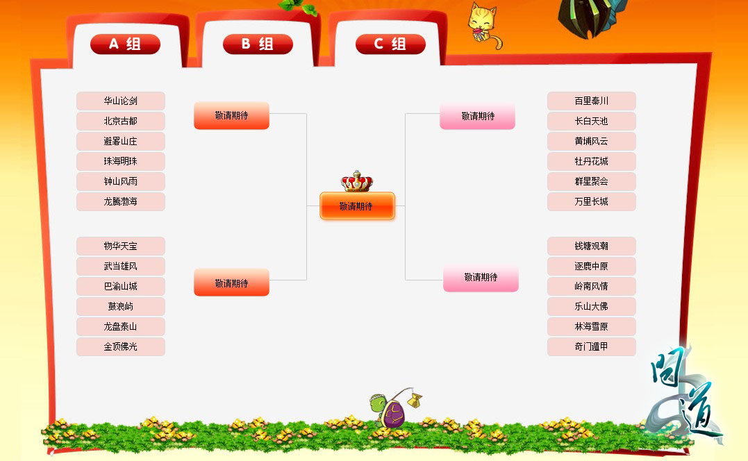 为了减小服务器之间的实力差距,《问道》跨服大战的策划人员将72家参赛服务器进行了合理分组,分成了ABC三个大赛区,每个赛区还有4组小组进行循环赛,充分且公平地分配了各区组实力之外,循环赛也带给玩家充分的势力展示良机。