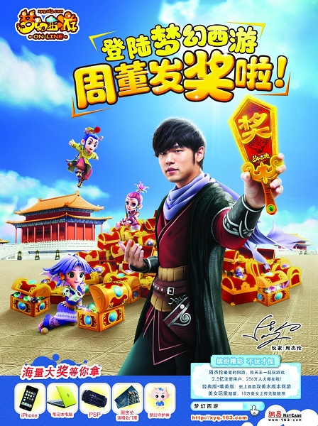 周杰伦联手有着小杰伦之称的侯高俊杰拍摄的最新宣传片受到了杰迷的热切关注,片中周杰伦化身“礼品天使”大秀热舞号召玩家参与活动,这就是《梦幻西游》的最新电视宣传片。视频中,周杰伦的那一句“登录梦幻西游,周董我发奖啦”让我们看到了天王巨星童真童趣、活泼搞怪的一面。 周杰伦派发《梦幻西游》大奖可谓真正意义上的大手笔,玩家不仅可以获得可爱公仔、海量Q币、笔记本电脑、iPhone等大礼,更有神秘的“周杰伦礼包”免费拿哦!而完成游戏内玩法的玩家还有机会获得周杰伦签名CD、照片、海报,甚至是周杰伦全球巡回演唱会的门票等大礼!玩游戏即可得珍贵异常的周杰伦演唱会门票,这种VIP级待遇也只有《梦幻西游》玩家才可以享受了!
