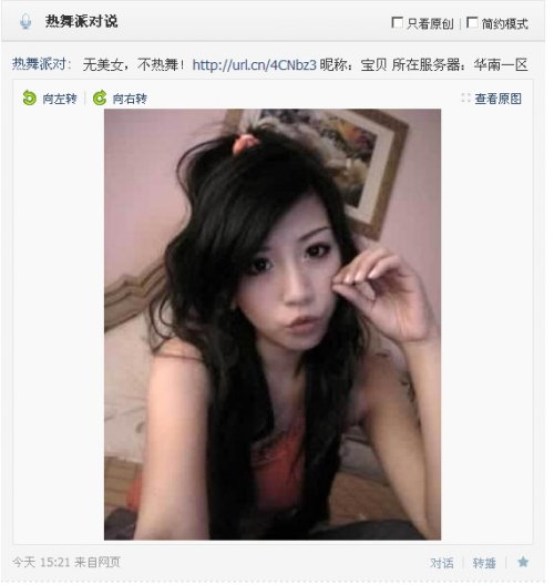 跟新浪微博一样,在这个全新的腾讯“围脖”中,玩家也同样可以看到最新的有趣消息!它们或许是一条刚刚发生在网络中的搞笑囧闻;又或许是某个热舞玩家最新晒出来个个人靓照。只要守候在这里,一定会有惊喜分享给你哦! 热舞MM资料快送快收