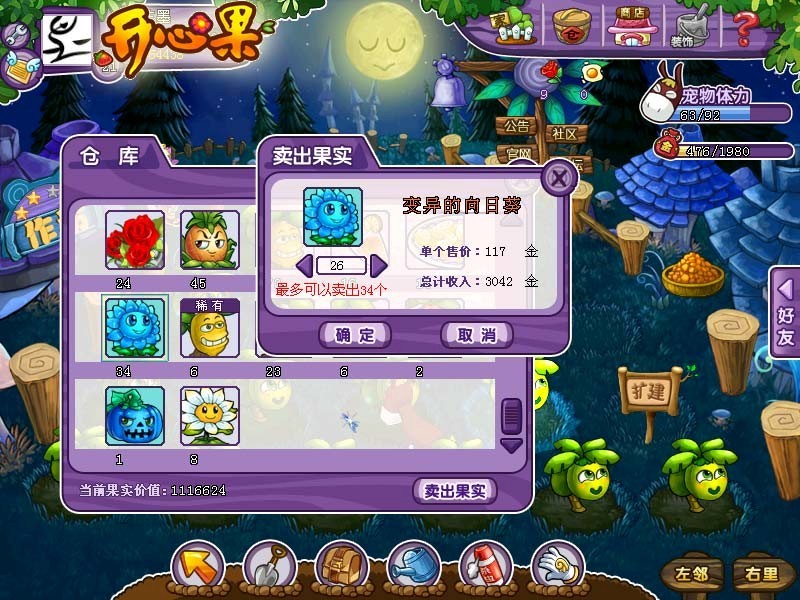 变异水果收益高 什么是变异水果?大家可不要想到变异的凶残怪物。在作坊开启之后,我们可以用普通水果的果实合成同类变异水果的种子,变异水果成熟后,收获的产值是普通水果的3倍! 以大家常见的向日葵为例,510金一颗向日葵种子,产出26棵向日葵,价值为1014金;将这26棵向日葵合成变异的向日葵种子,种植后可以收获3042金——正好3倍,聪明的玩家知道怎么选择了吧? 变异种子收益高