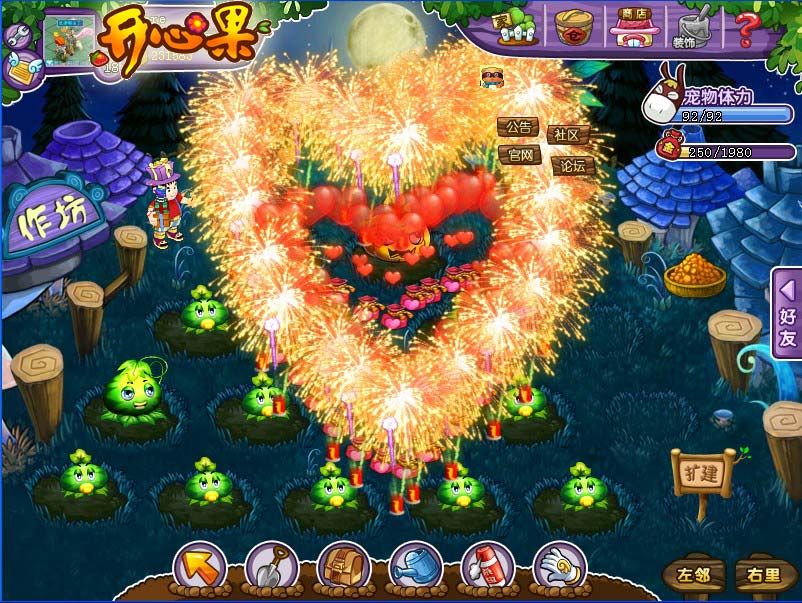 中国最浪漫的节日——七夕,就要来了。在这中国的情人节,传说天上的牛郎、织女在夜晚相会于鹊桥;而地上的恋人们也不甘寂寞,手牵着手温馨地行走在街头巷尾。《开心果》中的广大玩家可不要干等着,我们可以行动起来,让果园中同样浪漫缤纷,提前迎接七夕的到来。 烟花绽放爱心飞舞 用烟花来庆祝节日,用爱心来表达情意。在《开心果》中,烟花和爱心包应该是历史最悠久的浪漫物件了。这一片美丽果园,天生就适合让我们摆放爱情的象征,并且组成自己心爱的形状。是摆成爱心,还是摆成一个520?这就考验我们的动手能力了。 烟花与爱心齐飞