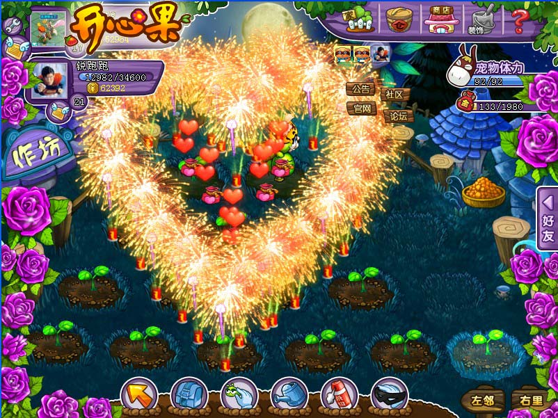 浪漫玫瑰爱情边框 玫瑰象征着喜悦和爱情,那么紫玫瑰呢?象征着深深的爱情。体态较小、香气浓郁的紫玫瑰也来到了果园,我们可以将它做成爱情边框,让果园瞬间充满柔情蜜意。再配上烟花漫天,爱心飞舞,这是怎样的浪漫景象。注意,这时可别让好友在你果园摆上猪头,煞了风景。 爱情边框浪漫无边