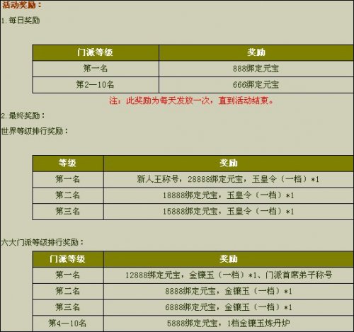 争做首席门派弟子 海量元宝、极品道具唾手得 8月13日14点-8月22日24点期间,《西游记》新区“小白龙”将开启“门派首席弟子争夺赛”活动。活动时间内,凡游戏等级排名前十的六大门派玩家均可获得海量元宝、拉风称号、极品道具奖励,而活动结束后世界排名前三的玩家,更有耀人好礼等你拿! 争霸赛奖励列表 整装待发狂练级