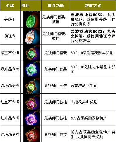 相关物品获取途径 玩家可以在各大师门的“高级师门兑换NPC”处兑换相应的师门套装或披挂,第二套师门套装=90级师门套装(披挂)+令牌+佛祖令(菩萨玉)进行兑换。