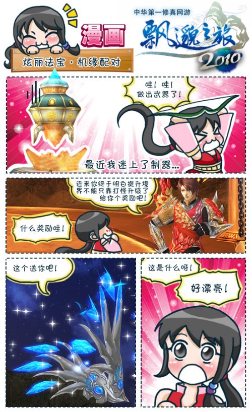 在《飘邈之旅2010》的世界里,炫丽的法宝和不尽的机缘,无疑是游戏的鲜明亮点和创意特色,吸引着一拨拨同好为一探奥秘而乐此不疲。 可现在,我们可爱的萝莉MM竟然也迷上了制器和配对,HOHO,她……她又会如何出奇制胜,打造出什么怪异的法宝来呢?又有谁会如此“幸运”或“倒霉”地让她给搜到最终配对一双?哈哈,带着好奇和迷茫,带着探求和追寻,带着虚幻和梦想,与小萝莉漫画第4弹可爱出发!