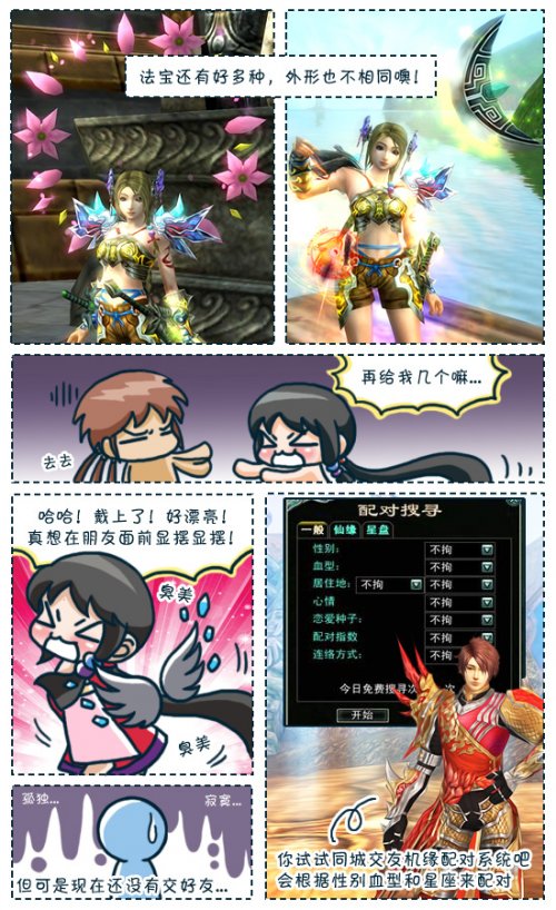 哇哦,宝石制成的翅膀真的好漂亮!怪不得小MM会那么爱不释手呢!其实除了这些,《飘邈之旅2010》还有更多令人惊艳又属性强大的法宝,不过,这可就要靠你努力学习制造咯! “不过……喂……MM,你不是有李强GG了嘛?怎么还去配对……” 只见MM在电脑前“奋笔疾书”——“我靠,没见本姑娘正忙着吗?”咚咚锵咚咚锵……“咦?又一个A型处女座耶!” 咚咚锵咚咚锵…… …… 那,下一集再见咯! 关于《飘邈之旅2010》 栩栩如生的飘邈世界,华丽炫目的技能特效。由网络三大奇书改编的经典网游《飘邈之旅2010》将中西画风完美结合,独添个性鲜明的星座名片,让你体验一场玄妙机缘的奇幻之旅——天戮战场,公会讨伐战,幻境征夺战,跨区攻城电信联通万人乱斗……更有种类繁多的炫目法宝,十一重境界的自在修真等游戏内容等待您来亲自发掘。 《飘邈之旅2010》今夏震撼问世,化神入魔、普天修真,让我们共同期待! [编辑:灰色] |