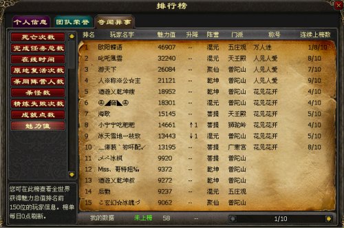 活动二、寻找七夕魅力达人 在《西游记》中,有很多达人凭借自身的魅力征服了众多玩家的心。他(她)们也许不是本领最高强的,但是他(她)们的人气一定是最旺的!在8月16日七夕节这天,游戏魅力排行榜上魅力值最高的玩家将可获得情人节纪念法宝“碧玉鸟(男性玩家获得)”或“青羽雀(女性玩家获得)”1只,同时获得“七夕魅力达人”称号。 魅力值排行榜