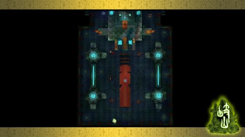 龙神宫是一个“凸”字型的宫殿,虽然说不上漆黑一团,但光线也十分昏暗。地图最下方是副本入口,左侧较为壮观的便是龙神宫复活点,阴阳八卦缓慢旋转,被一个巨大的碧色咒符所笼罩,很有涅槃重生的感觉。大殿中央是红底金纹的长地毯,直通大殿深处;中间有尊巨大的青铜鼎,小BOSS死守附近。地毯两侧是水池高台,四台各有一块闪闪发光的“灵精珠”,而诸多精英怪就在周围徘徊,“真*岩石”、“真*仙灵花”奇宝遍布殿中,供闯关玩家采摘。沿地毯走到宫殿深处,两龙喷水,三座石桥,后面便是大BOSS狼王的所在。咒符遍布、莲花灯相映,一颗硕大的光球位于中央;左侧便是副本出口,无论胜败玩家均可由此出宫。“龙神宫”的华丽神秘,堪比单机3D大作。 龙神宫鸟瞰全景
