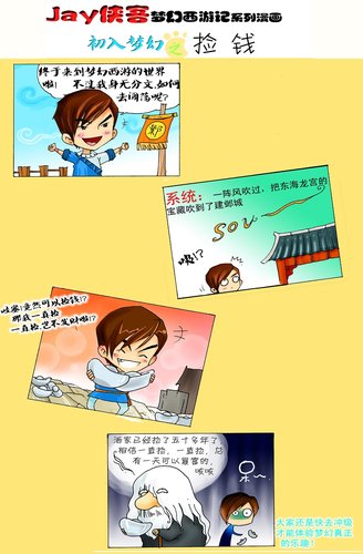 周杰伦代言引发了全民玩《梦幻西游》的炫酷新潮流,周杰伦在接受采访时公开透露平常也经常玩《梦幻西游》,并且还带着身边的工作人员一起玩。于是,周杰伦怎么玩梦幻西游、在游戏中会有怎么样奇特的经历成为了玩家和歌迷们纷纷讨论的焦点。 近日有玩家创作了“Jay侠客梦幻西游记系列漫画”,其中以周杰伦形象创作的Jay侠客(寓意《梦幻西游》里的“剑侠客”,这也是周杰伦公开最为喜欢的游戏角色)可爱又不失幽默、超萌而不失灵气,其中周杰伦与“狐狸精”的章节就是其中精品。漫画一出,便拥有粉丝无数,现在就让我们看看周杰伦是如何“闯荡”梦幻西游的吧! 捡钱