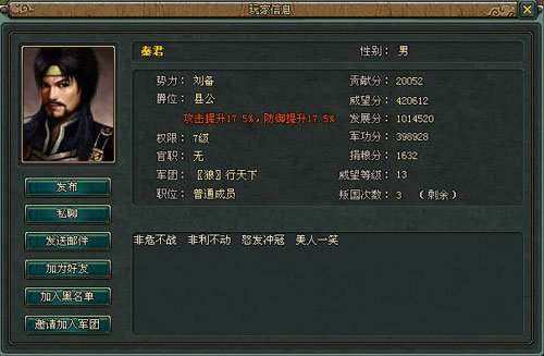 是否承受过柔弱的酸楚! 是否也经历过团灭惨烈! 是否已看淡了功名利禄! 是否又向往过去的纯洁! 在《千军破》的乱世沙场里,他们或者独来独往,或者沉默少言,但他们都有一个共同点,那就是忠实与战斗、痴迷于战场!今天我们就来一睹英雄们的风采! “秦君”-非危不战、非利不动、怒发冲冠、美人一笑!此君天庭饱满,气度不凡。从身份证照上已见端倪!