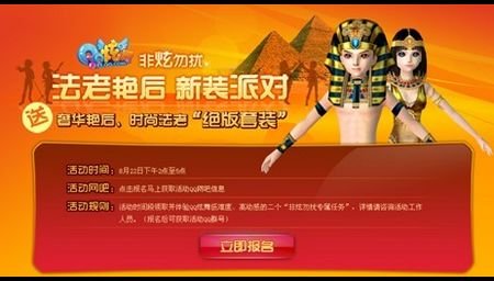所有《QQ炫舞》的玩家们一定还记得那已经绝版的“法老万岁”与“埃及艳后”情侣套装吧?那充满着异域风情的服装款式,仿佛真的要带玩家回归到那神秘而古老的古代埃及。已经绝迹于舞台多时的绝版套装如今重现QQ炫舞!只要来参加QQ网吧“非炫勿扰”活动,就有机会将其抱回家哦! 在准备参加活动之前,先来了解下活动详情吧。8月22日下午2点至5点,只要你在活动QQ网吧登录炫舞,领取并完成低难度高动感的两个“非炫勿扰专属任务”,即算成功参与活动。既然是情侣套装,届时就一定要叫上自己心爱的Ta一同来参加活动哦! 试想一下你们同时穿着绝版套装时,旁人投来的惊艳目光吧。那金灿灿的YY上镶嵌着各色宝石与大量金线,奢华的做工诉说着这套YY是多么的与众不同。那么如何才能得到它呢?