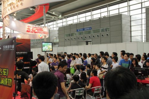 深圳站——首发之站,玩家热情踊跃 在本次SSC的首发之战——深圳站,个人赛玩家报名人数有28万,而车队赛玩家报名人数则高达120万,从报名情况来看,玩家们热情高涨,对比赛充满期待。四月,《QQ飞车》SSC线下区域赛首战广东,广东赛区四城卫星赛先后打响,第一周分别在广州及珠海举行了两场海选,第二周分别在东莞及深圳举办了两场比赛。每一场比赛都吸引了不少飞车玩家的到来,比赛的网吧里可以说是座无虚席,热闹非凡。不仅如此,SSC深圳站线下决赛还引起了众多媒体的关注,包括CCTV的众多优质电视媒体采访报道,同时还有新浪、搜狐、多玩等国内一流门户的网媒传播。 深圳站现场情景