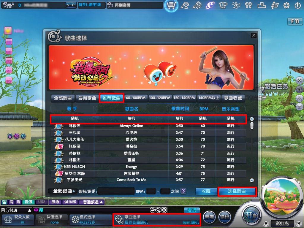 今天我就听官方推荐的歌! 同样的操作方式,玩家还可以根据个人喜好,将不同速度的区间段进行随机,比如只玩150BPM-180BPM的话,就可以在歌曲选择界面下方将这两个BPM值输入,按下回车键,再点击选中第一行的“随机”,最后点击右下角的“选择歌曲”按钮就可以啦!这样选出来的歌曲就是随机播放你所选中的BPM区间的歌曲咯!