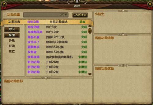 多种功勋记录成长历程 《猎国》的功勋系统从多个方面记录玩家的各种成长。从打怪次数到死亡次数,从招募卫队到参加演武场活动,从升级到制造装备,功勋系统记录大家的方方面面!每一步的成长,每一次经历都有可能成为你的功勋哦!目前在《猎国》中推出了接近20种功勋,更多的功勋正在开发中! 超值奖励功勋送 《猎国》功勋系统不仅记录了成长经历,还赠送各种超值奖励呢!伴随着每次功勋的获得,大家都可以获得《猎国》赠送的各种礼物,可能是海量的经验,也可能是海量的金钱,还可能是各种神秘礼品!