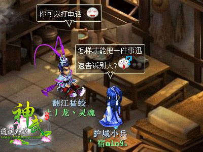 最新免费回合制网游《神武》自从不删档封测以来,向来都不乏可爱的创作型人才,他们对事物的理解以及对游戏素材的利用和发挥达已经达到了一定高度,正在向更高处努力奋进。现在就来看一看他们为我们带来的最新爆笑四格——女人最厉害! 为何女人最厉害?请看下文具体分析! 服务器推荐: 天下无双(双线) 风云再起(电信新开) 某日,一名“护城小兵”与“翻江猛蛟”在《神武》饭店相遇,此时,“护城小兵”在思考一个“深刻”的问题:怎样才能把一件事迅速告诉别人,看来这位“护城小兵”在自己的岗位上那是兢兢业业努力奋斗!于是乎,高手“翻江猛蛟”告诉他:“你可以打电话。” 不过我们的“护城小兵”似乎对电话的速度不是特别满意,觉得手机信号不够稳定,于是又向高手寻求更快的传播方法。高手马上给出了一个能让很多人满意的答案:你可以上网。的确,只要在《神武》里面随便一喊,随便说一句话,别人立马就就收到你的消息了!