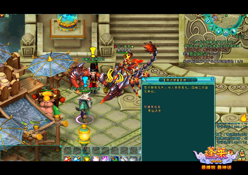 锦囊二:每日任务 鱼和熊掌可兼得 什么?嫌送的太少。在这里我额外为你送个精囊妙计。别着急,游戏里还有两个每日任务!年轻的勇士们总是心有余而经验不足,加入每日任务的行列中来,将是你的明智的选择,在这里勇士们可以学会很多相当实用的中国神话知识,经验也是快速的飙升。 20级别以上的玩家,可以到东莱洲的【寻访使者】游四方处接任务。玩家通过任务中的提示,稍微运动一下你的食指,与任务中的NPC交谈,马上就可获得丰厚的经验奖励,不耗药不打怪,够轻松了吧。还有更妙的是,你跑NPC的过程中可以做一做系统的答题活动,动动小脑筋,一举两得啊。另外一个22级以上的任务,东莱洲骠骑大将军处接取,需要打怪,累是累点,奖励双倍道具,自己选择吧。 每日任务之寻访任务 每日任务之骠骑令任务