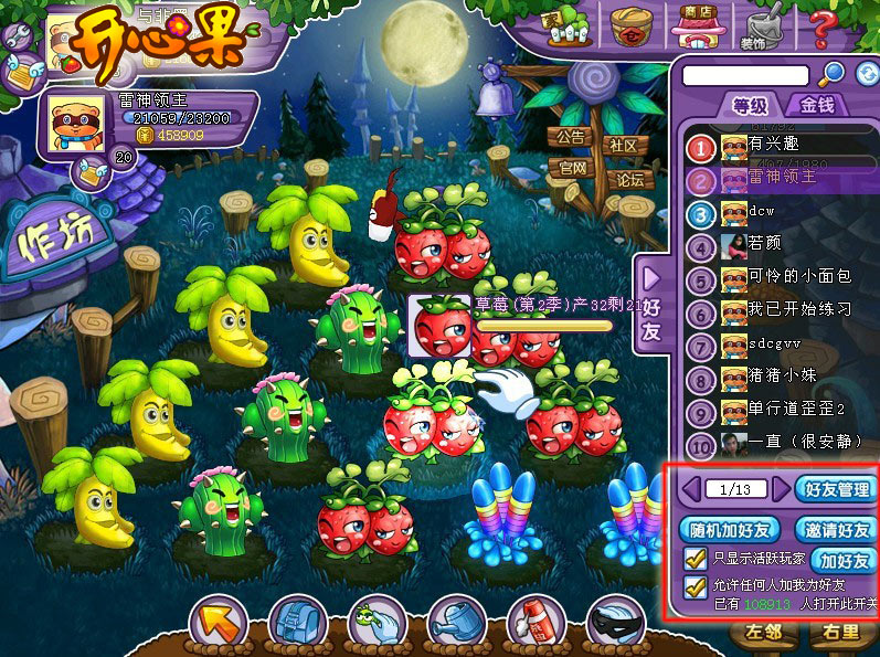 方法二:偷出来的富翁 你的好友没有别人多,怎么能偷到更多的果实呢?想要更大收获,不多加好友是不行的,好友越多,下手的机会也越多,偷到的果实当然也就更多啦!除了多加好友外,准时偷菜、收菜也是很必要的,每种果实都有自己的生长周期,清楚自己家和好友家的果实在什么阶段,我们就可以判断果实将在什么时候成熟,这样就不会错过势在必得的果实了。对了,去哪加好友呢?在《开心果》的游戏里就可以加新朋友;在游戏外也可以叫上老朋友一起来玩! 多加好友,偷菜不愁