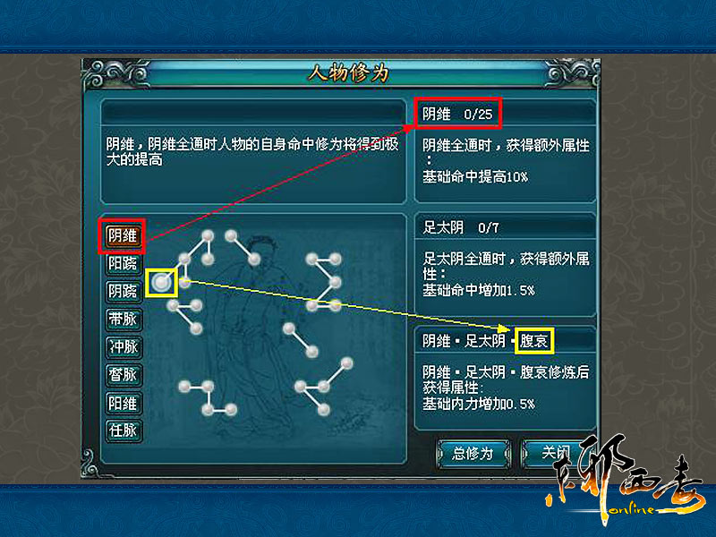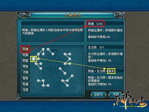 修为系统图文详解 《东邪西毒》为了给玩家带来纯正的江湖体验,开创了可提高角色自身能力的修为系统。修为分为阴维、阳跷、阴跷、带脉、冲脉、督脉、阳维、任脉8种,每种修为下面有不同的子类,按照奇经八脉进行分布。图中选中的为“阴维--足太阴--腹哀”。 当经脉处于未激活状态的时候, 显示为灰白色。 选中其中的一个,在右侧的面板上会显示相应的加成属性。当处于激活状态的时候该经脉显示为黄色。即图中黄色点为激活点,激活的为“阳跷--足太阴--殷门”。