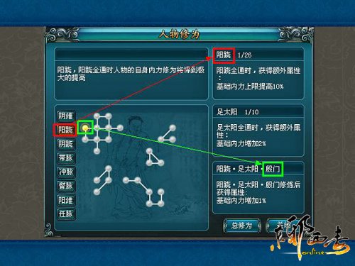 激活连接状态,修为激活相互连接时会有额外的属性加成。下图为阳跷全激活状态。