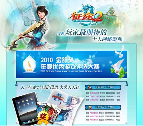 有着“游戏业奥斯卡”之称的“金翎奖”堪称国内最具权威、规模最大、媒体关注度最高的游戏评选活动。这场游戏界的盛事吸引了众多游戏媒体和玩家们的高度关注,票选结果更直接反映了玩家的需求以及对游戏品质的考 2010“金翎奖”再度来袭!各大游戏厂商摩拳擦掌,意图在本届大赛上一决高下! 作为巨人网络2010年备受瞩目的2D武侠巨作,《征途2》承载了400游戏制作人的梦想、更是亿万玩家的快乐的源泉。本届“金翎奖”评选大赛中,《征途2》众望所归的入围“玩家最期待的十大网络游戏”候选名单。 在广大玩家的深切厚爱下,《征途2》将力博金翎奖。即日起,玩家为《征途2》投票,则有机会获得惊喜礼品和IPAD哦!!!心动不如行动,拿起你的手机,和我们一起进入到《征途2》的世界。 精美礼品 《征途2》:“喜欢我,就给我投一票吧!” [编辑:糖糖] |