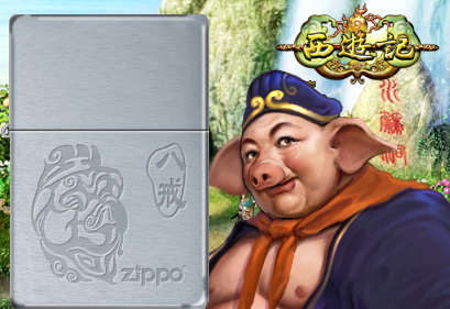 猪八戒 《西游记》网游中的猪八戒性格愚钝憨直,取经意志力最为薄弱,动不动就嚷嚷着分行李散伙,西行路上曾对各色女子动过邪念,还念念不忘地要回他的高老庄。猪八戒好大喜功,在与妖怪打斗的过程中,他往往都是在悟空快要清场的时候,才大喊着跑出来挥上几耙子:“妖怪,让你见识见识你猪爷爷的厉害!” 猪八戒的这些性格特点,在《西游记》网游中体现的淋漓尽致,在游戏中,玩家还可以扮演高老庄的高大小姐,上演一出“猪八戒背媳妇”的好戏!Zippo火机上的八戒造型,憨厚可爱,富态十足,笑眯眯的样子彷佛已经彻底从单身生活中解放出来。