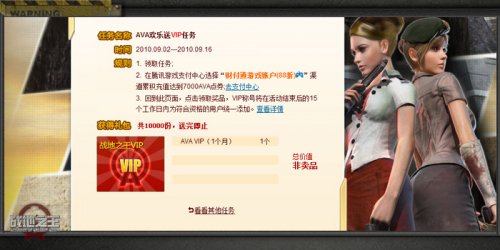 玩家千万不要以为可以轻松完成的任务奖励一定很“朴素”,本次AVA“欢乐送”大礼堪称奢华!例如完成初级任务(在账户中累计充值达到1000点券)即可获得初级礼包:100%经验卡(3天)1、金属伪装面具面罩(3天)1个、AUG (7天)1个 总价值20QB:完成7000点券的高级任务即可获得高级礼包VIP尊贵体验(一个月)。AVA为您量身打造的初级、中级、高级三重任务总有一款适合您。 AVA 战士总会抓住最适合的时机扣动扳机!因为机会稍纵即逝,它不容错过!“AVA欢乐送”恭候您的大驾! [编辑:糖糖] |