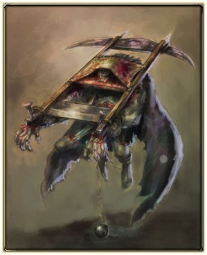 冥界使者 冥界使者是往生者的灵魂堕入魔界后,重新苏醒的物体。 为了猎取活人的灵魂而现形。穿着破烂的长袍的骷髅风貌,又随身带着巨大的鎌刀,因此人们对他感到害怕并称之为“死神”。 传说他将自己的灵魂献给了魔王,而自己只能靠着他人的灵魂来让自己活着,但事实如何就没有人知道了。有关他猎取灵魂的理由及风貌,都存在着许多谜团。 因为是意象体,所以用一般的武器很难伤害到他。 斩首者 代表怪物——斩首者 全长 约180cm虽然依然是人们感到很害怕的【死神】般的角色,但是换掉了随身带着的镰刀,而是扣着手铐,看起来像个罪人。