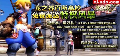 参与方式: 1,访问龙之谷高校免费派送特权风暴活动网站:http://act.dn.sdo.com/100902schoolvip/index.asp 2,进行网络预约登记 3,您所预约的校区满100人登记 4,《龙之谷》官方工作人员将前往该高校进行发放活动,您可获得“谷噜噗”绿龙卡等《龙之谷》高校专属礼包。 江苏高校免费派送地点: 南通大学(新校区) 徐州医学院(新校区) 徐州市中国矿业大学(新校区) 南京市河海大学(江宁) 南京师范大学(仙林) 南京理工大学 南京林业大学 奖品设置: 1,《龙之谷》二章最新客户端 2,《龙之谷》操作手册 3,一张《龙之谷》谷噜噗绿龙卡(包含4个新手激活码,每个码可兑换翅膀一个、装套一套) 4,若4个激活码均被激活,则该4名玩家组队在活动期间可获得好友经验加成。 5,《龙之谷》精美海报年历一张。
